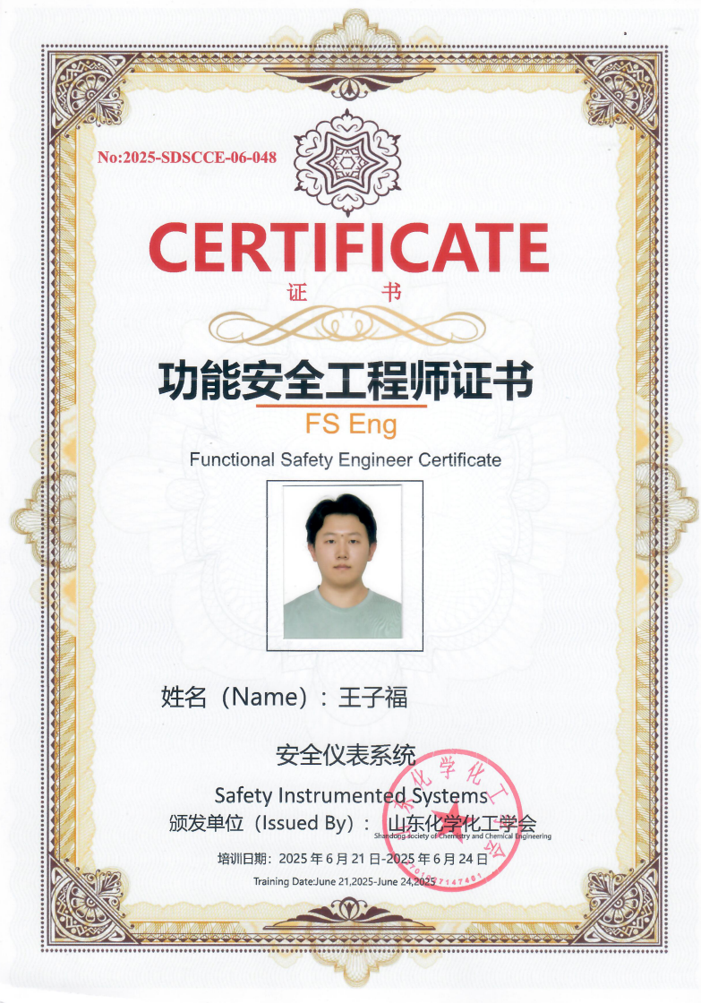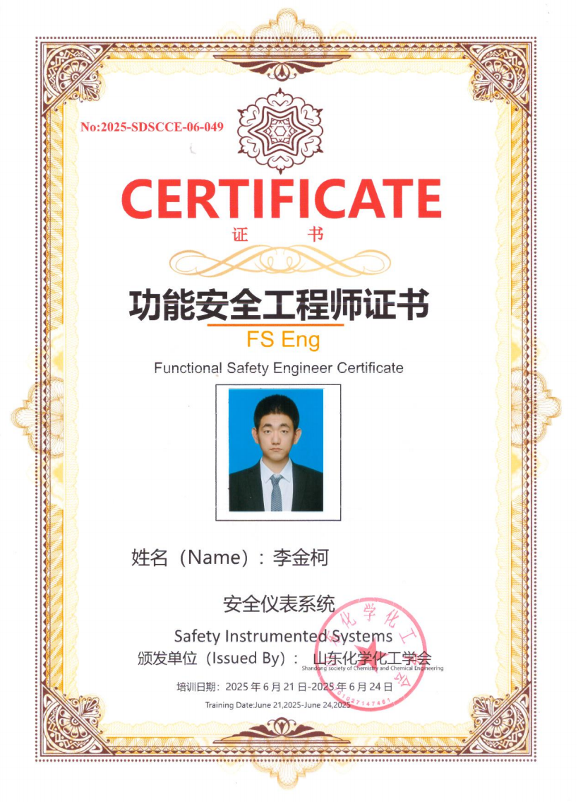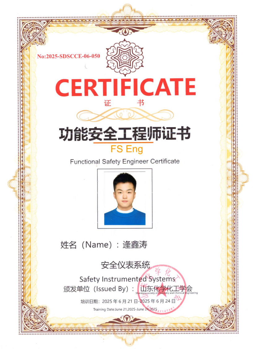 通過(guò)系統(tǒng)學(xué)習(xí),公司參訓(xùn)成員對(duì)儀表自動(dòng)化控制及聯(lián)鎖系統(tǒng)有了更深入的理解,并全員通過(guò)考核,成功獲得由山東化學(xué)化工學(xué)會(huì)頒發(fā)的“功能安全工程師”證書(shū)。此次培訓(xùn)不僅為公司打造了一支具備功能安全認(rèn)證資質(zhì)的專業(yè)團(tuán)隊(duì),更顯著提升了企業(yè)在行業(yè)中的競(jìng)爭(zhēng)力。